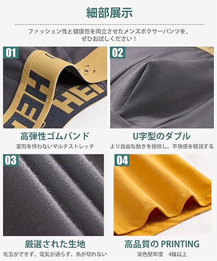 商品詳細 【腰の窮屈感なし・快適な履き心地】メンズボクサーパンツは高い伸縮性を持つ素材と丁寧な縫製によって、ずれや引き上げの心配がなく安心して着用いただけます。アクティブな一日を過ごしても、快適さを保ちながら、腹部を適度にサポートし、安定感を提供します。ボクサーパンツのウエストバンドは伸縮性に優れ、長時間使用しても緩むことはありません。ボクサーパンツの裾はカール防止加工が施されているため、快適な履き心地で足を締め付けません。